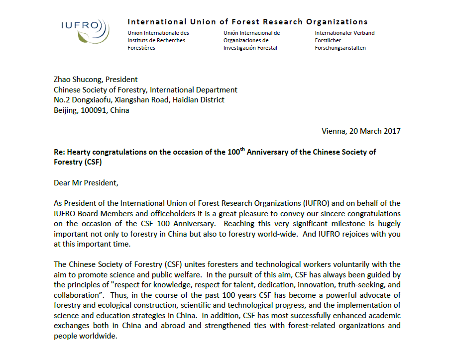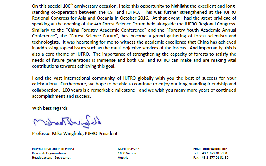 我同国际林联等一系列国际相关组织衷心祝愿中国林学会百年庆典成功!同时我也真诚希望双方友谊长青,共续合作的新篇章!百年庆典是贵会发展史上的重要里程碑,我希望在未来贵会能够取得持续的发展和成就!