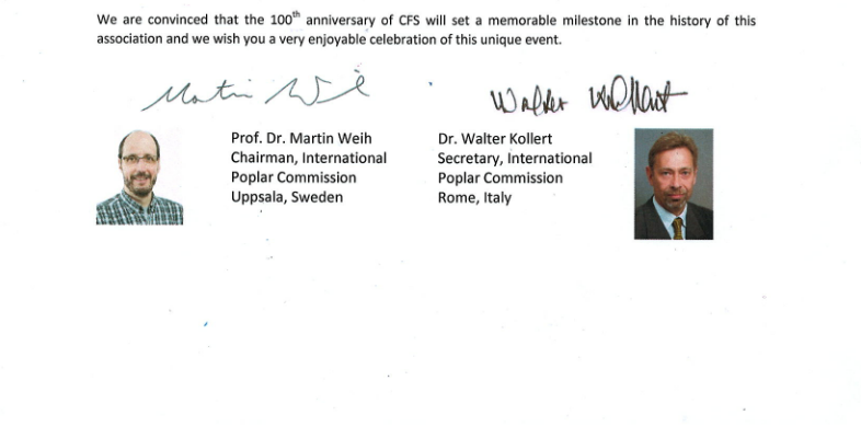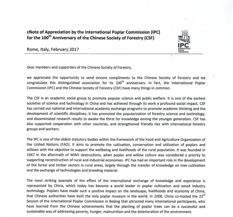 为中国林学会书写贺信庆祝百年华诞,我们感到十分荣幸。实际上,国际杨树委员会(International Poplar Commission, IPC)和中国林学会有许多共同之处。