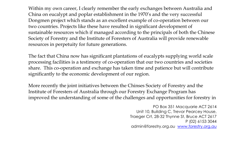 最近,中国林学会和澳大利亚林学会通过双方的合作项目,在两国都关心的林业发展的挑战和机遇领域进行了深入交流,两学会的合作为两国的交流起到了助推作用。去年10月份,两国林学会在北京签署了合作备忘录,我深切希望,我们能在整个亚太地区的林业专业机构范围内开展合作,这对森林经营者将是极大的提高,也将极大促进我们的的森林经营管理的专业性。