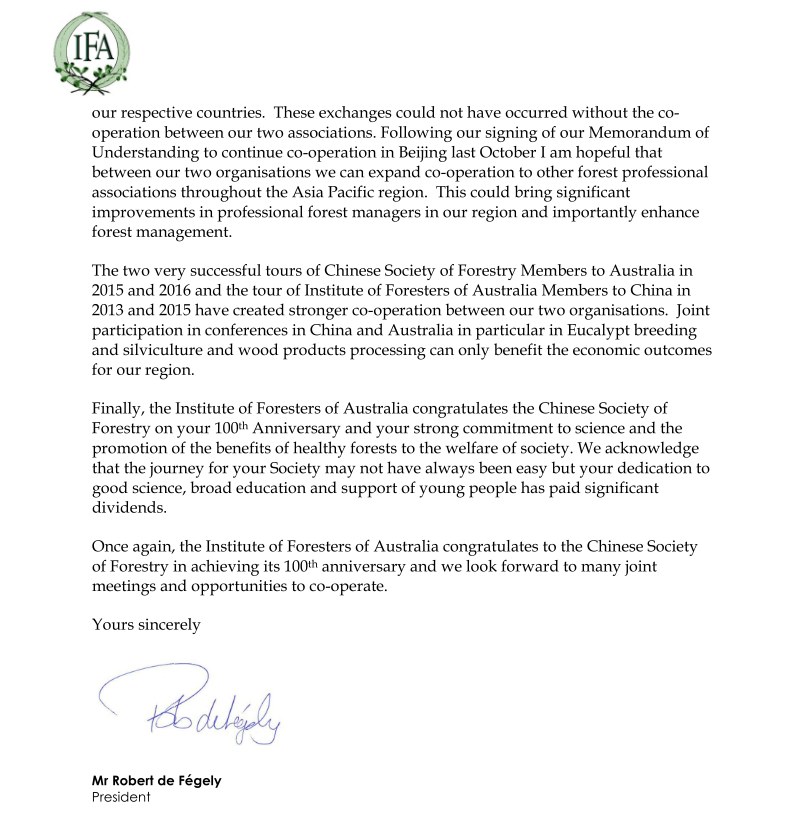 最后,澳大利亚林学会衷心祝愿中国林学会百年庆典成功,希望中国林学会在科技发展及林业促进社会福利的道路上继续前行。我们深知,前进的道路并不会永远平坦,但是中国林学会在推进科学进步,科技普及以及青年助推领域尽心尽力谋发展已取得显著成绩。