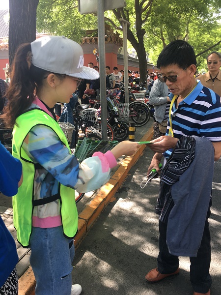 在颐和园、天坛公园、北海公园、景山公园、香山公园、北京市植物园、北京动物园、玉渊潭公园、陶然亭公园、紫竹院公园、人定湖公园、龙潭公园、地坛公园、玉蜓公园、朝阳公园和海淀公园等16个人流量密集的大型公园及周边社区,穿着莹绿色宣传马夹的志愿者们,顶着烈日向公众分发着杨柳飞絮科普宣传折页。他们用自己的专业知识向游人们讲解杨柳飞絮的科学知识,告诉市民要正确认识杨柳飞絮这一自然现象,治理飞絮不是简单的“一砍了之”,治理需要一个更新的过程。希望市民们都能自觉从身边的小事做起,做护绿、爱绿的志愿者,力所能及保护好城市森林生态系统,为首都园林绿化和环境保护贡献自己的一份力量。