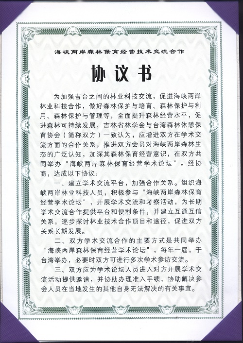 2017年7月15日,吉林省林学会在龙湾国家级自然保护区举行两岸森林保育经营技术交流合作协议签字仪式,吉林省林学会理事长王志新与台湾森林休憩保育协会理事长施文智在协议书上签字,吉林省林学会副秘书长林涵和森林休憩保育分会理事长高方莲、副理事长王志强,台湾嘉义大学生命科学院院长朱纪实、副教授夏沧琪,以及龙湾林学会副理事长殷德成、秘书长孙立国等相关人员见证了这一重要时刻。