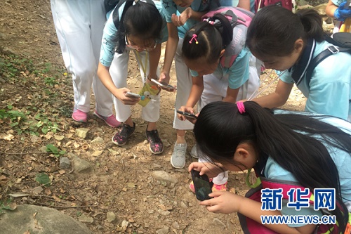 孩子们正在认真观察在保护区发现的新奇昆虫