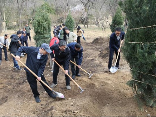 上午10时许,春风和煦,万物复苏,在位于北京植物园的植树现场,参加义务植树的领导同志们和会员代表一起拿起铁锹来到树苗前,相互配合着回填泥土、堆起围堰、剪断麻绳、整理树形,随后拎起水桶、围堰浇水,认真地种下每一株白皮松,同时,还同大家一起畅谈造林绿化、美化环境、保护生态的看法,活动场面热火朝天。经过半个多小时的忙碌劳动,一株株新种植的白皮松错落有致、迎风挺立。