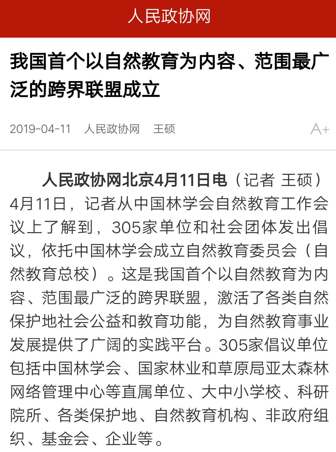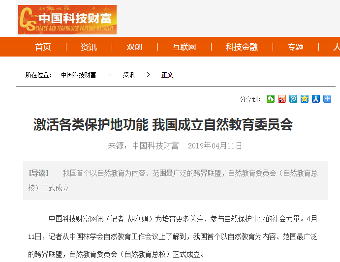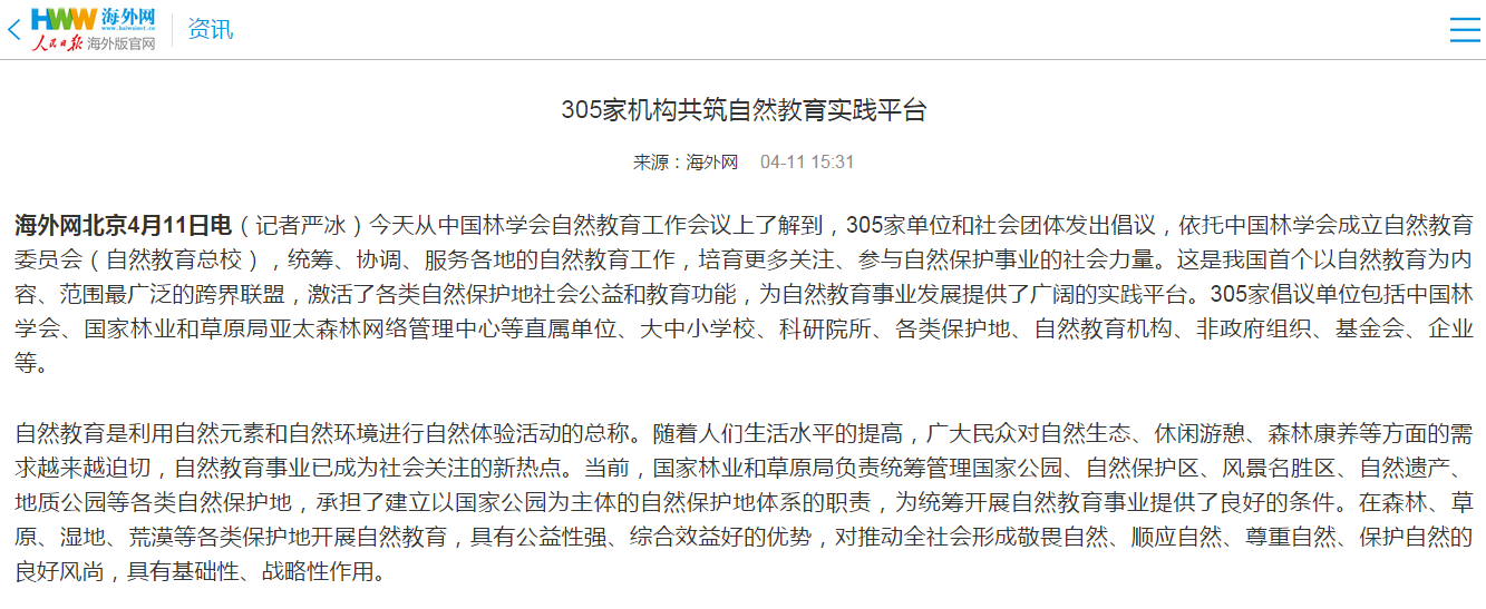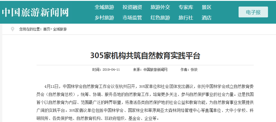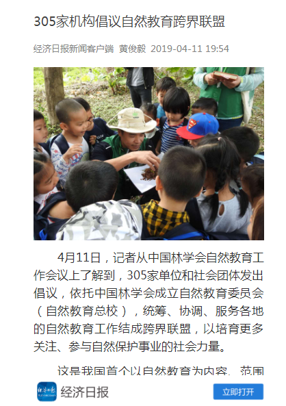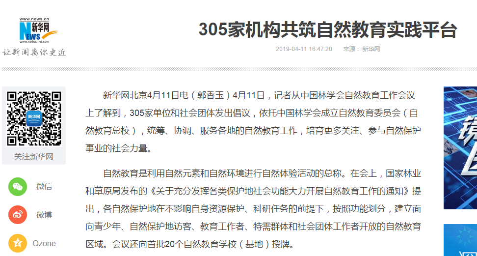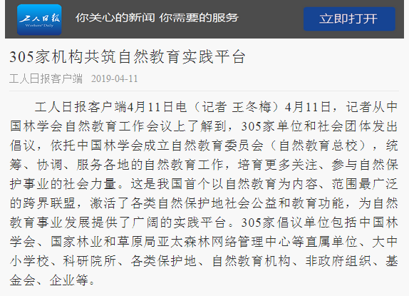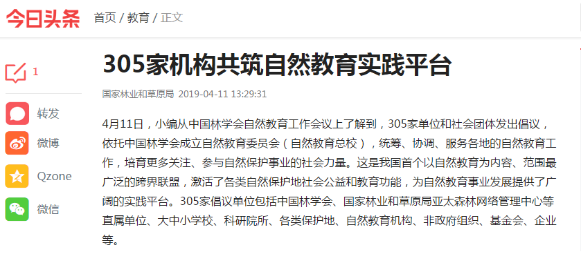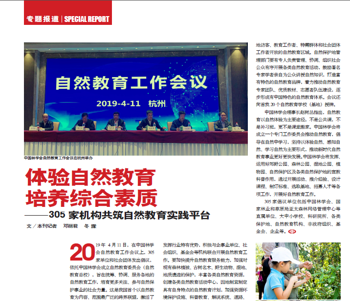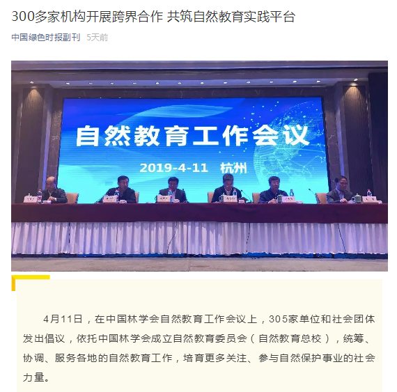 2019年4月11日,由中国林学会举办的自然教育工作会议在杭州召开,多家主流媒体、门户网站及重点资讯信息平台在第一时间进行报道,广泛关注并报道会议成果。