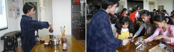 还有茶席陈设、茶艺课程等动手实践和体验,让小朋友惊叹不已,近距离感悟到茶文化优雅、精致的美学内涵。