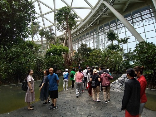 6月17日上午8点,学会秘书处工会一行在北京世园局工作人员的带领下,由7号门进入世园会。首先参观的是植物馆。植物馆汇集了天南地北的各种植物,建筑表面机理以植物根系为灵感,庞大的垂坠根系向下不断蔓延,将植物原本隐藏于地下的强大生命力直观呈现,不仅产生强烈的视觉冲击,更带领参观者踏上一场以感受植物根系力量为起点的奇妙植物世界之旅。此外,植物馆顶层登高远眺,可以将妫水河、海坨山以及中国馆、天田山等北京世园美景尽收眼底。