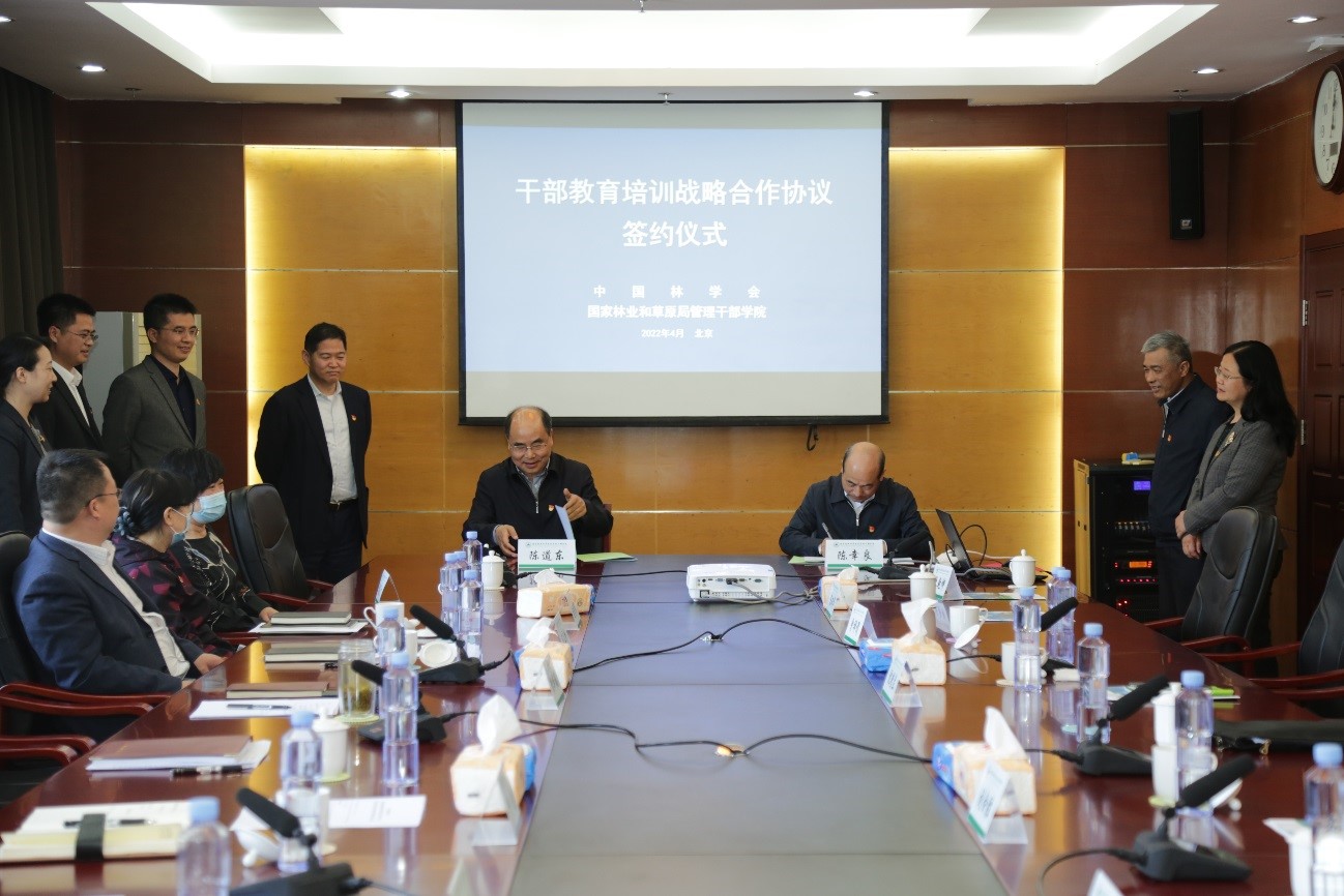 2022年4月14日,中国林学会与国家林业和草原局管理干部学院签署了干部教育培训合作协议。学会秘书长陈幸良,副秘书长刘合胜、沈瑾兰和学会各部室负责同志,国家林业和草原局管理干部学院常务副院长陈道东,党委副书记彭华福,副院长严剑、陈立桥和有关处室负责同志参加签约仪式。