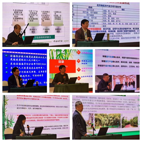 与会专家围绕“南竹北移”和“以竹代塑”等主题进行了学术交流。中国林学会副理事长兼秘书长陈幸良研究员,国际竹藤中心范少辉研究员,福建农林大学原副校长郑郁善教授,浙江竹境文化旅游发展股份有限公司董事长蔡卫,山东农业大学林学院曹帮华教授,山东省林业科学研究院刘翠兰研究员,聊城市自然资源和规划局副局长、市林业局副局长张景臣等7位专家分别作了《林下经济实践创新与学科演进》《北方竹林的历史演变、现状与发展》《沙质海岸高效笋竹两用防护竹林体系关键技术研究与应用》《圆竹建筑的无限创造》《山东省“南竹北移”研究与实践》《山东省竹种引种驯化选育及竹林景观恢复研究》《竹子在景观生态建设中的科学应用及其生物多样性研究》的专题报告。