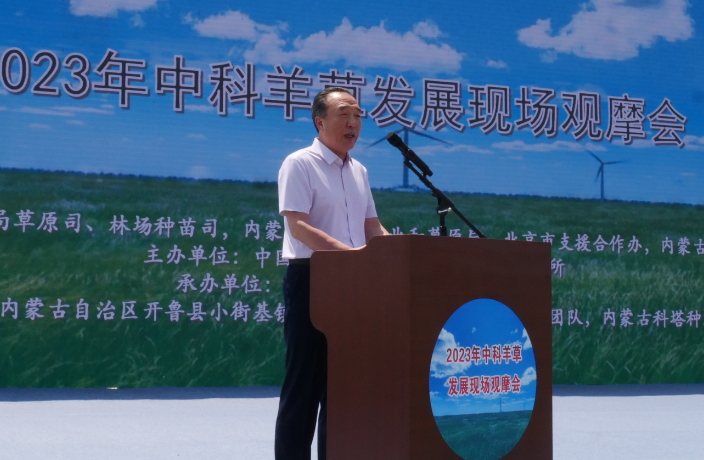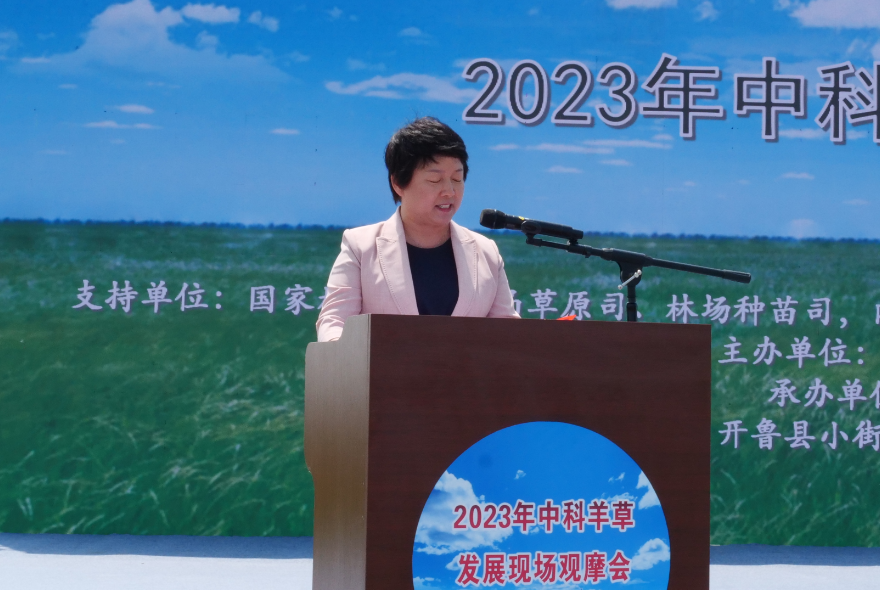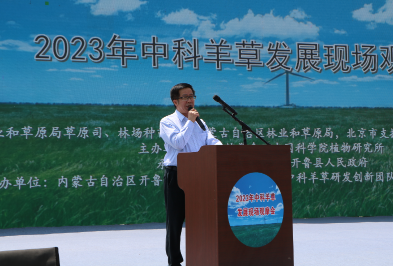 通辽市政府赵白玉二级巡视员在致辞中指出,通辽市紧紧围绕服务落实五大任务,把“绿色”作为产业可持续发展的“生命线”,通过探索发展中科羊草产业,与中科院植物研究所中科羊草研发团队合作,打造中科羊草原种植基地,在重度沙化、盐碱化草地推广种植方面,取得了扎扎实实的生态成效,形成了“科研团队+政府+企业+村集体经济组织+农户”的利益联结模式,总结出生态增绿、土壤改良、产业发展、群众增收等一系列比较好的经验做法。