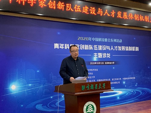 2020年10月12日,中国林学会于北京林业大学采取线上线下相结合的方式成功组织举办了2020年中国科技峰会系列活动第二十六期——青年科学家创新队伍建设与人才发展体制机制主题沙龙(以下简称“沙龙”)。沙龙由中国科学技术协会主办,中国林学会承办,北京林业大学协办。中国工程院院士尹伟伦、中国林学会副理事长兼秘书长陈幸良、国际竹藤中心常务副主任费本华、国家林业和草原局人事司人才劳资处处长刘庆红、北京林业大学副校长李雄,来自林业和草原领域机关高校、研究机构和企业的从事人才培养和管理的领导和专家,以及北京林业大学的青年教师和研究生近50人出席了此次沙龙活动。
