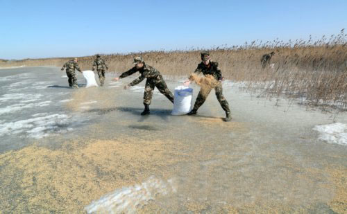 为保护这些不速之客,锦州市边防支队凌海大队建业边防派出所成立爱鸟护鸟小分队,每天巡护在灰鹤栖息地,风雪无阻,成为渤海湾湿地护鸟人。图为护鸟小分队为灰鹤投放食物。