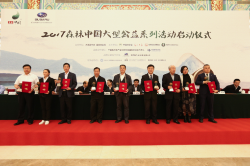 全国绿化委员会副主任、中国林学会理事长赵树丛,共青团中央书记处书记傅振邦,国家林业局党组成员、副局长彭有冬,光明日报社编委张碧涌,中国林学会副理事长兼秘书长陈幸良,中国光华科技基金会党委书记兼理事长侯宝森,中国野生动物保护协会副会长、秘书长李青文,中国林学会副秘书长李冬生,斯巴鲁汽车(中国)有限公司董事·总经理永江靖志共同宣布“2017森林中国大型公益系列活动”正式启动。
