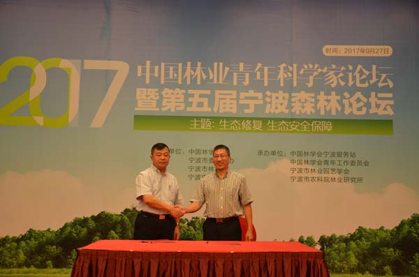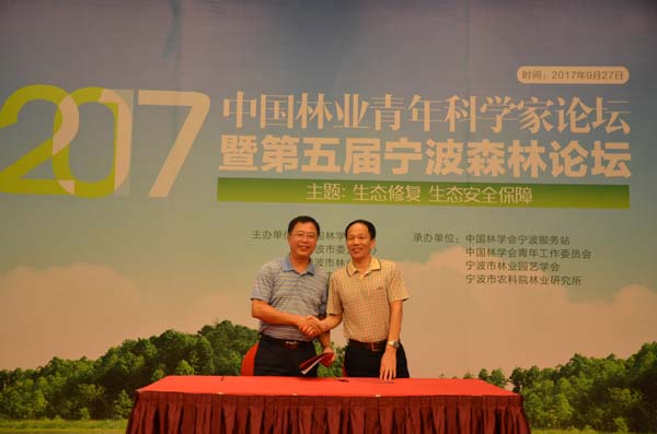 中国林学会学术部主任曾祥谓和宁波市林业局党委委员、巡视员、宁波市林业园艺学会理事长朱永伟分别代表双方单位签署了“合作共建中国林业乡土专家电子商务与运行平台”协议。