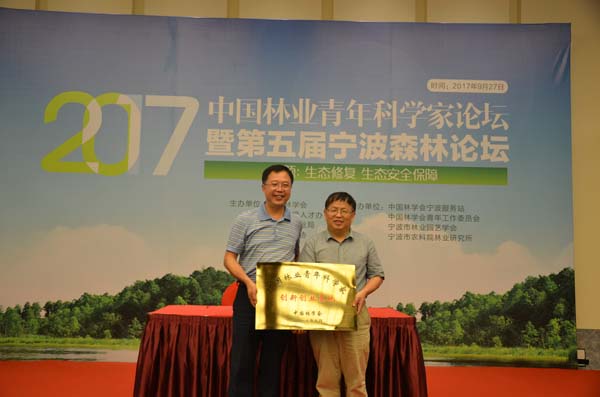中国林学会学术部主任曾祥谓和宁波市林业园艺学会秘书长陆志敏共同进行了“中国林业青年科学家创新创业基地”授牌仪式。
