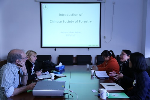 首先,中国林学会国际部官秀玲处长向两位法国专家介绍了中国林学会的发展现状及国际交流与合作的相关事宜,并着重介绍了学会在栎类天然林保护经营中突出的作用以及在国际合作中的优势,期待法国专家能够在天然林保护和经营管理方面给予指导,并寻求双方合作。中国林业科学研究院科信所吴水荣研究员向法国专家介绍了中国林业科学研究院在森林经营管理方面的情况,并回顾了在天然林保护方面与法国合作取得的丰硕成果,并就林地政策制定等问题与专家展开了讨论。