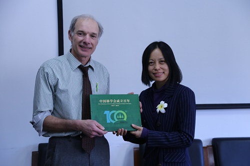 2017年11月3日,中国林学会国际处处长官秀玲,受中国林学会领导的委托,代表中国林学会在北京会见了法国巴黎高科农业学院伊夫(Yves Ehrhart)教授和法国大使馆科技专员苏菲(Sophie de BENTZMANN)女士,就今后中法两国的林业方面的合作交流进行了座谈。中国林业科学研究院科信所吴水荣研究员陪同参加了此次座谈。