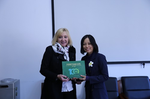 中国林学会国际处处长官秀玲(右)与法国大使馆科技专员苏菲(Sophie de BENTZMANN)(左)合影
