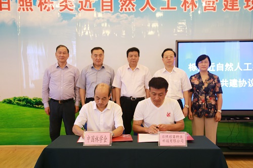 开幕式上,中国林学会副理事长兼秘书长陈幸良代表中国林学会与日照彩苗种业科技有限公司总经理李修堂共同签署了“栎类近自然人工林示范园共建协议”。在具体实施方面,中国林学会和企业分工明确,中国林学会发挥人才智库的优势,提供技术支撑与指导;企业发挥地域优势进行管理与运营,共同为促进日照当地的生态环境建设,普及传播栎类文化,尤其是为未来的木材储备作示范。