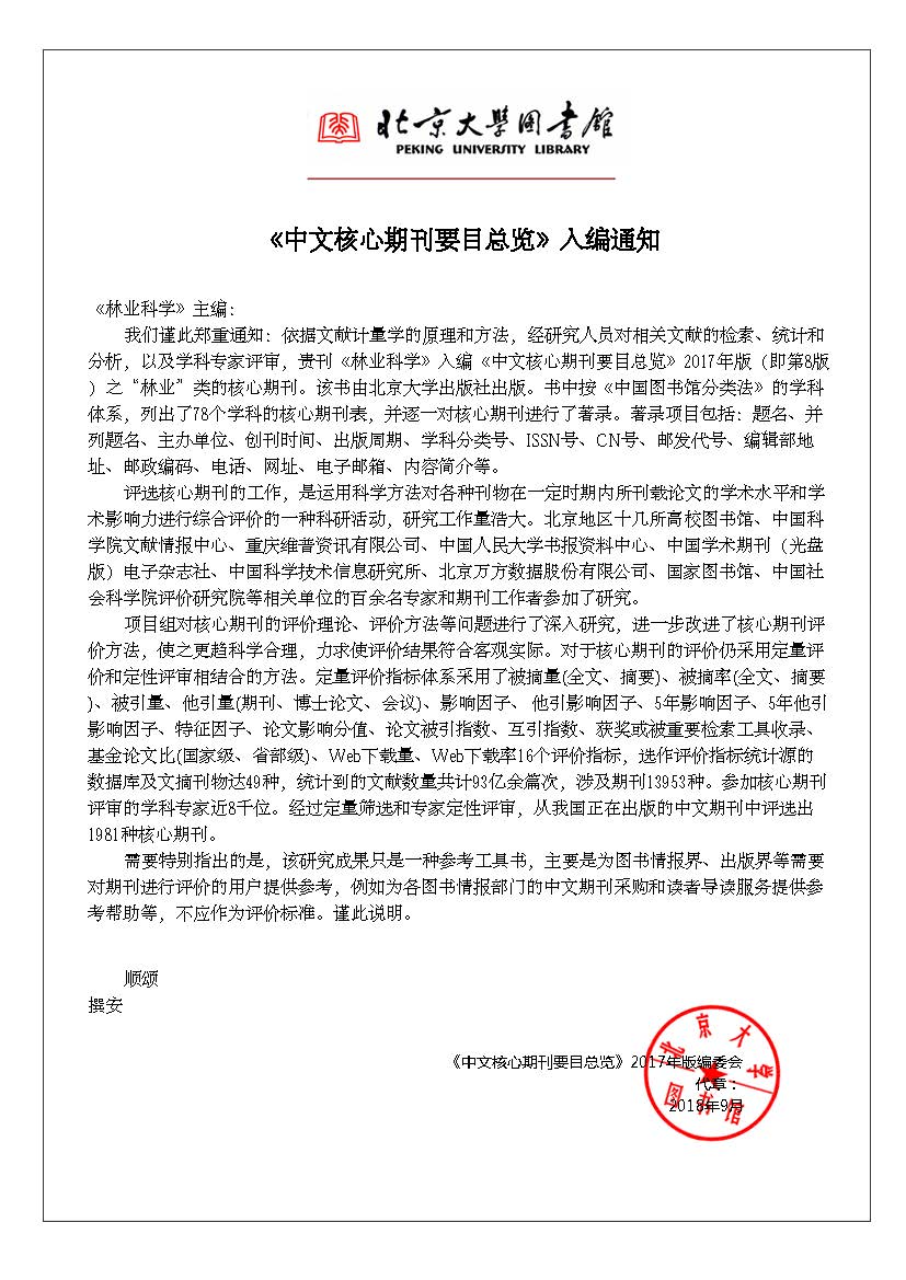 日前,《中文核心期刊要目总览》2017版(即第8版)发布,我国正在出版的中文期刊评选出1981种核心期刊,中国林学会主办的《林业科学》再次入编“林业”类的核心期刊。