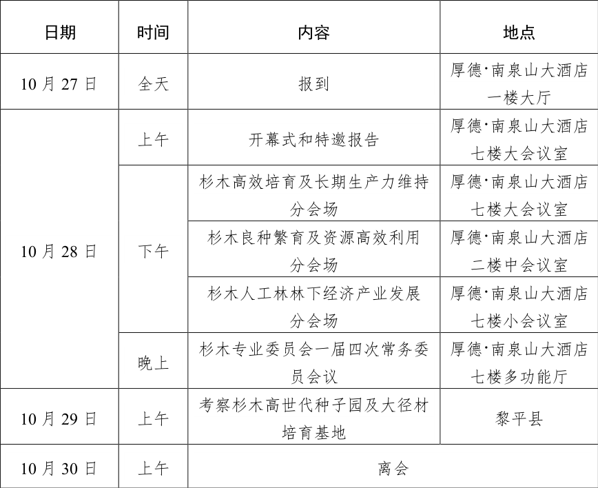 杉木是我国南方最重要的速生用材树种之一,其人工林面积、蓄积量和林业产值均居我国主要造林树种的前列,在我国南方林业产业发展中占有举足轻重的地位和作用。为促进杉木人工林质量精准提升,实现杉木产业持续、健康、稳定发展,助推地方脱贫攻坚和乡村振兴,经研究,中国林学会定于2019年10月下旬在贵州省黎平县召开第四届全国杉木学术研讨会暨杉木产业助推脱贫攻坚工作会议,现将会议有关事项通知如下: