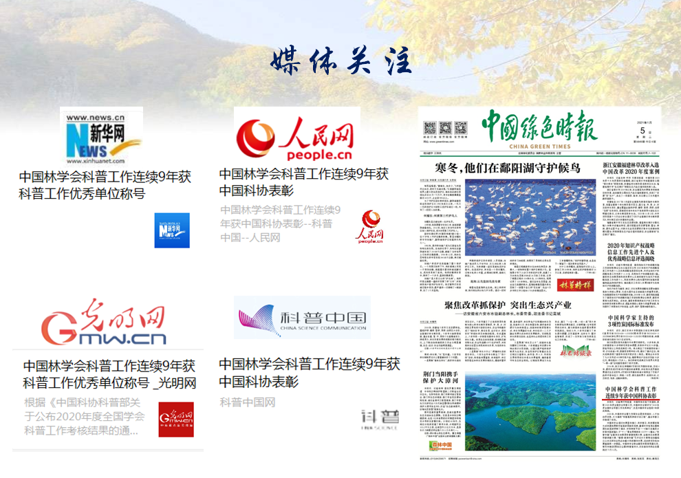 新华网、人民网、光明网、中国绿色时报、科普中国网对中国林学会科普工作连续9年获中国科协表彰进行了跟踪报道。