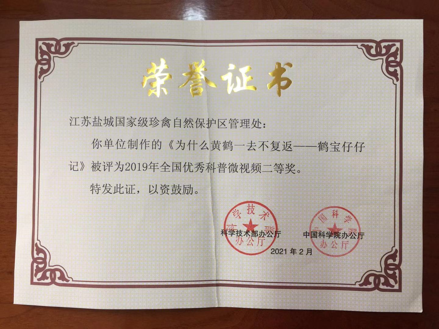 近日,科学技术部、中国科学院公布了2019年全国优秀科普微视频作品名单,由江苏盐城国家级珍禽自然保护区管理处、新华网股份有限公司分别制作,中国林学会推荐、国家林业和草原局报送的科普微视频作品《为什么黄鹤一去不复返——鹤宝仔仔记》、《“中国冷极”的绿色卫士》分获二、三等奖。