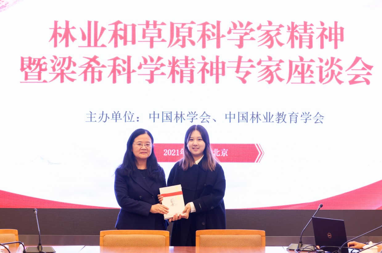 座谈会上,中国林学会沈瑾兰副秘书长向北京林业大学话剧《梁希》剧组赠送了《梁希文选》。