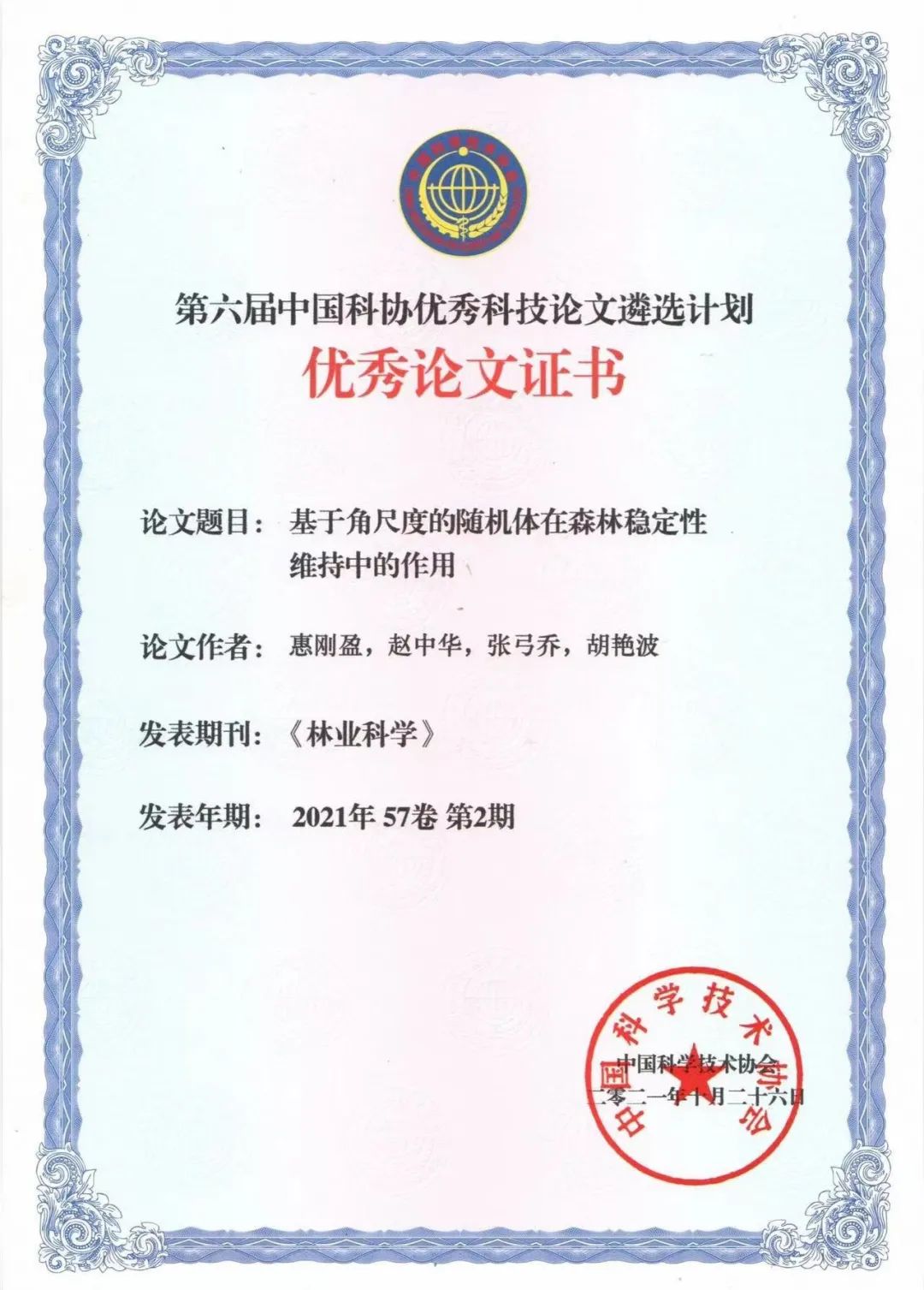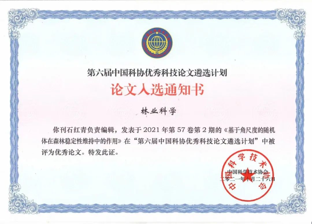近日,中国科协第六届优秀科技论文遴选计划结果公布。《林业科学》2021年第57卷第2期发表的“基于角尺度的随机体在森林稳定性维持中的作用”(作者:惠刚盈、赵中华、张弓乔、胡艳波,责任编辑:石红青)作为林业领域唯一论文入选。截至目前,林学领域共计5篇论文获得“中国科协优秀论文遴选计划优秀论文”殊荣,其中《林业科学》刊发论文4次入选。