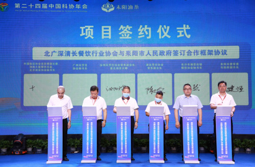 签约仪式环节,省部共建木本油料资源利用国家重点实验室与湖南神农国油生态农业发展有限公司、湖南中彬茶油科技有限公司签订油茶等木本油料全资源高值化研发合作框架协议;北广深清长餐饮行业协会与耒阳市人民政府签订合作框架协议。