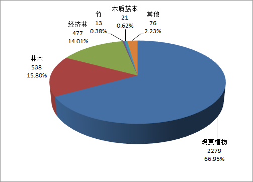 截至2021年底,在林业授权植物新品种中,木本观赏植物2279件,占总量的66.95%,其次是林木538件(15.80%)、经济林477件(14.01%)