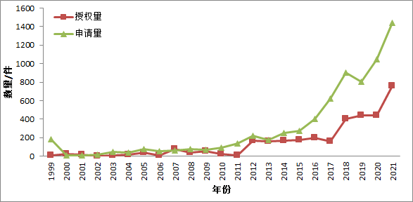 图片1999—2021年林业植物新品种申请量和授权量变化趋势