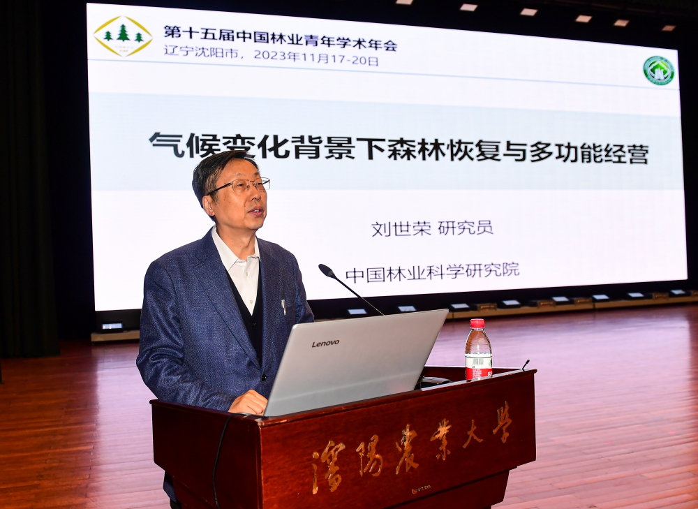 中国林学会副理事长、中国林业科学研究院刘世荣研究员作大会主旨报告