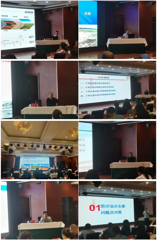 本次高研班聚焦不同类型区荒漠化综合防治、防沙治沙关键技术科技成果转化的实践与思考、荒漠化监测理论与方法、沙区植被修复及沙生植物资源培育、沙漠生态系统观测网络体系构建、沙化草地治理、沙产业开发、知识产权成果转化的路径探讨等多个方面的内容,精心设计研修课程,邀请到陕西省林业科学院生态修复研究所赵国平所长、甘肃省治沙研究所吴春荣研究员、内蒙古农业大学高永教授、甘肃省林业科学研究院马全林研究员、宁夏农林科学院林业与草地生态研究所田英副研究员、中国林科院荒漠化所副所长冯益明、中国林科院荒漠化所王锋研究员、宁夏农林科学院林业与草地生态研究所左忠研究员、宁夏农林科学院林业与草原生态研究所温学飞研究员、中卫市西郊林场场长唐希明,通过主旨报告、案例分析、互动交流等形式,分别以“陕西毛乌素沙地综合治理技术实践与思考”、“甘肃干旱区固沙技术”、“防沙治沙工程技术”、“干旱区退化固沙林修复的理论基础与技术模式”、“宁夏沙产业生态协同发展技术与模式”、“荒漠化/沙尘监测”、“稀树草原植被恢复”、“宁夏防沙治沙与生态保护高质量发展实用技术”、“沙区特色植物——柠条的利用”、“中卫防沙治沙新技术、新方法、新模式”为主题,从理论、实践、技术转化利用等多个方面进行授课。