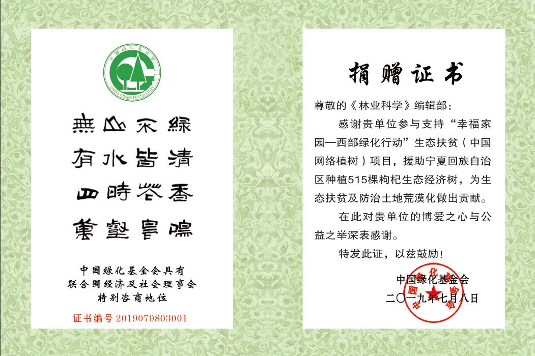 “幸福家园-西部绿化行动”是由中国绿化基金会启动的生态扶贫公益项目,旨在动员全社会力量,参与支持西部贫困地区生态环境保护与扶贫开发,帮助当地贫困家庭实现劳动脱贫、人与自然和谐相处的可持续发展目标;进一步增进全社会对生态文明、环境保护、扶贫减困的认识,使建设生态文明、保护环境以及扶贫减困等行为成为更多公民的自觉行动。2015年7月,《林业科学》与中国绿化基金会签署了捐赠协议(中绿基捐赠协议[2015]36号),协议规定《林业科学》每接收一篇论文,编辑部将向中国绿化基金会捐赠5元,用于绿化公益事业,该项目首期签约5年。此次捐出的善款则是根据2018年接收稿件数量所捐赠,截止目前,《林业科学》共计捐赠25360元,已经援助宁夏回族自治区贫困家庭种植共计2536棵枸杞生态经济树。
