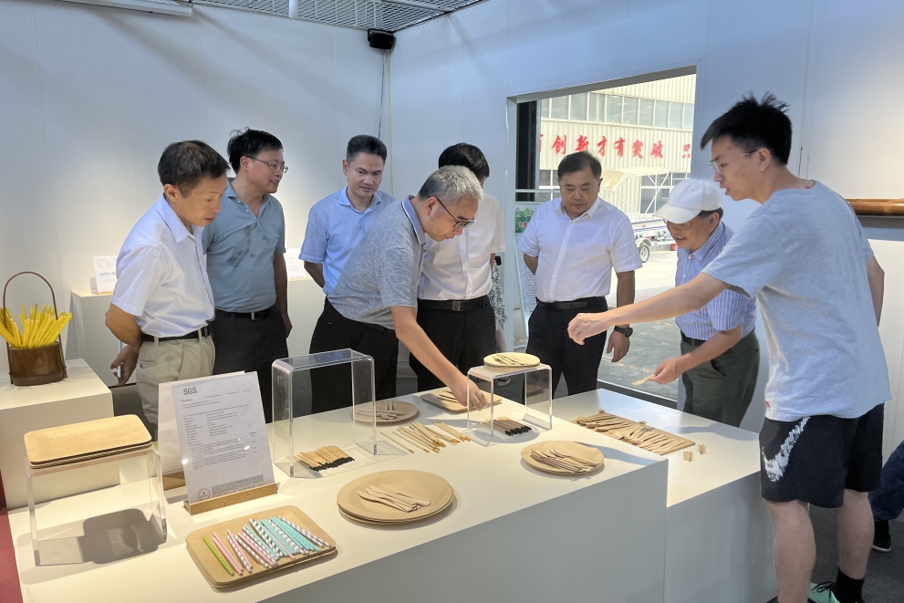 在湖北汇圆科技实业有限公司,科技服务团成员参观了其产品展示馆,对公司发展“以竹代塑”产品的发展思路表示肯定,希望公司积极提升竹刨切技术,创新生产工艺,提高竹材利用率,降低产品生产成本,提高公司产能和市场竞争力。