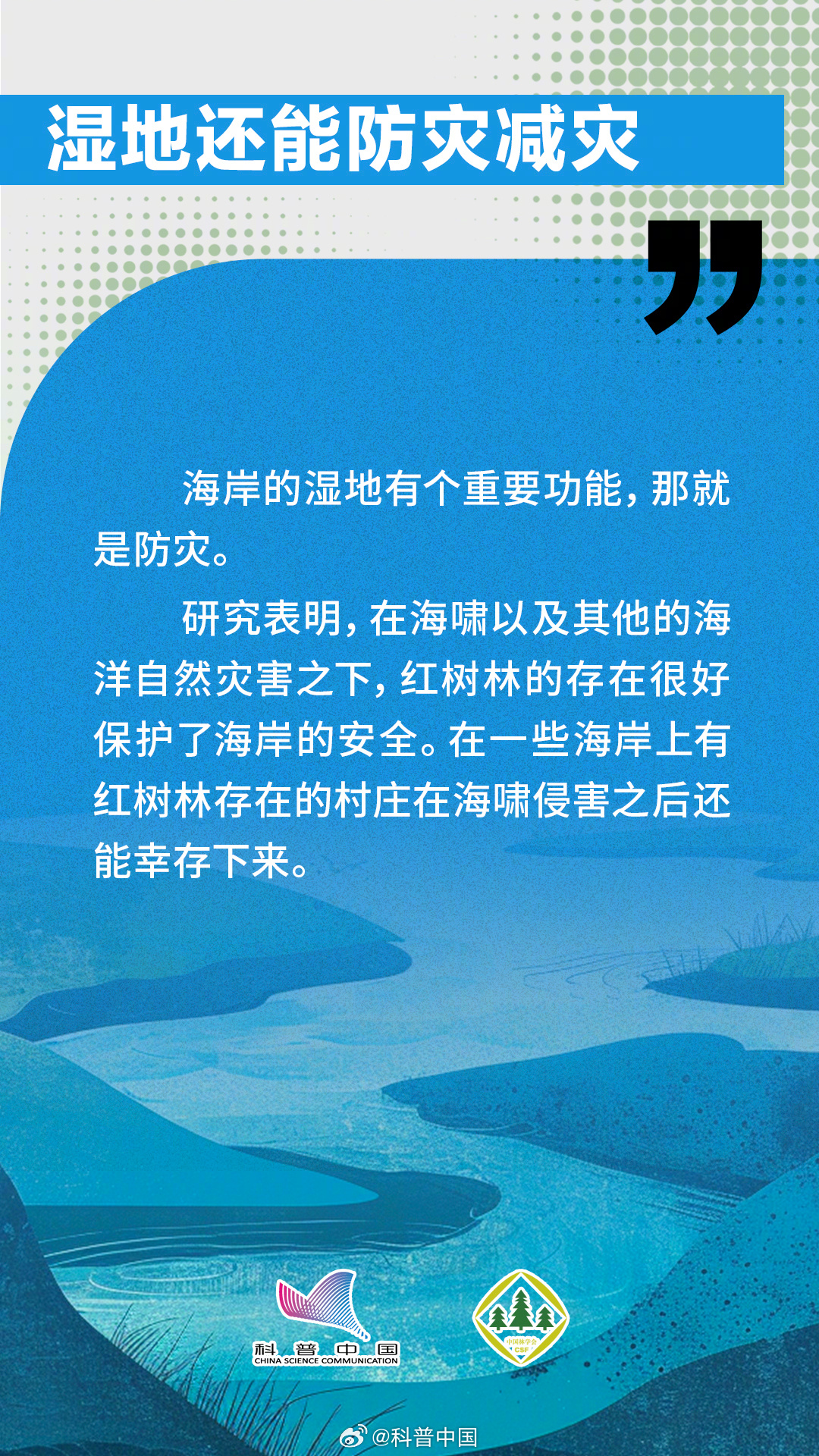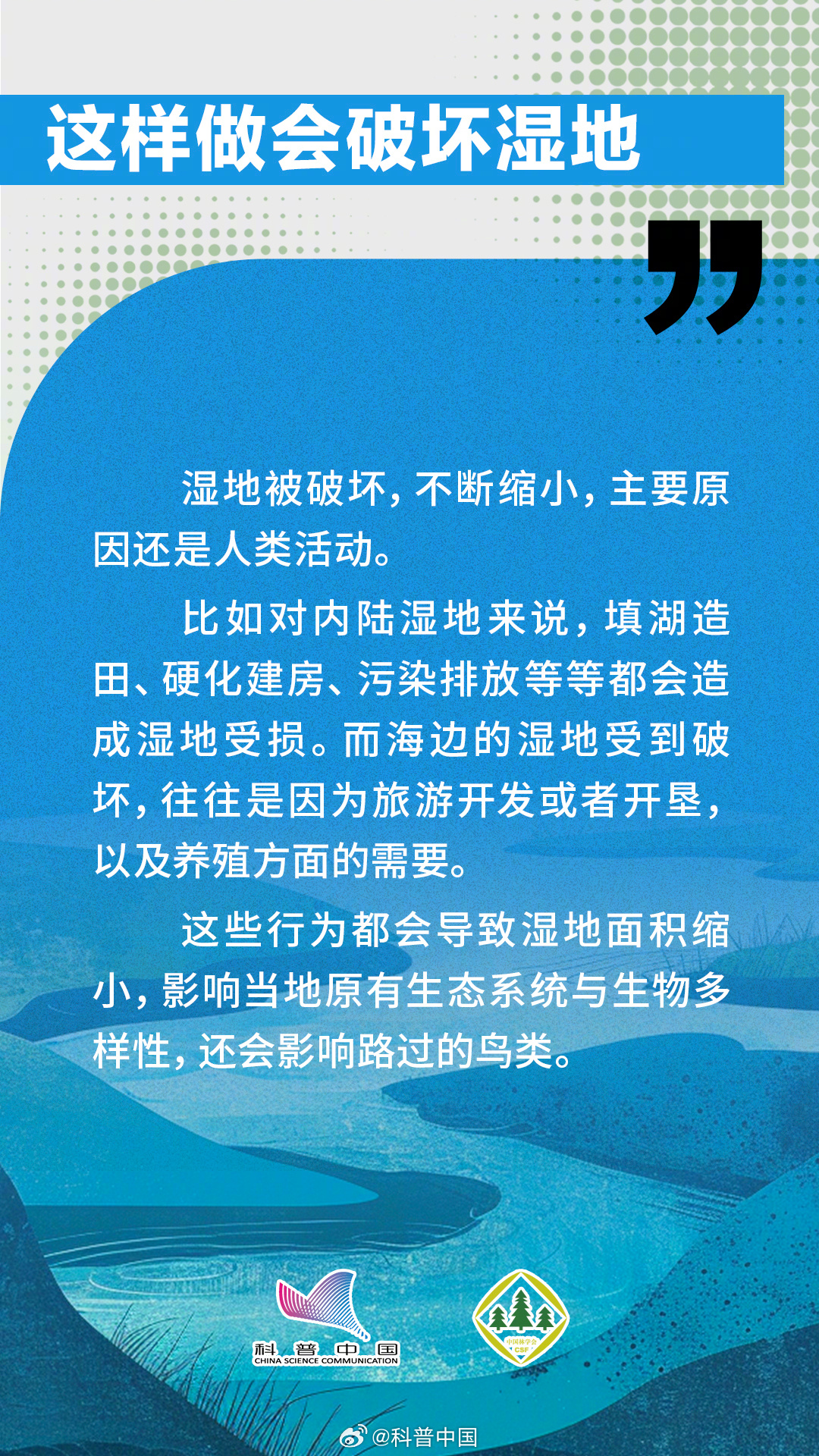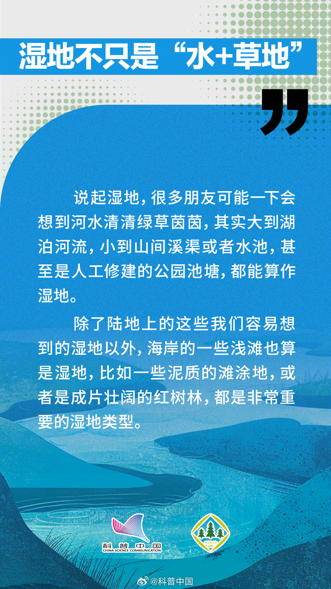 今天是2024年2月2日,第28个世界湿地日,主题是“湿地与人类福祉”。湿地介于水生生态系统和陆地生态系统之间,像海岸的浅滩、泥质的滩涂地和红树林都是非常重要的湿地类型。而且湿地还能起到涵养水源、防灾减灾、保护生态多样性的作用。究竟哪些做法会破坏湿地?湿地与人类之间又有什么关系呢?中国林学会与科普中国联合出品科普组图,让您了解“地球之肾”——湿地。