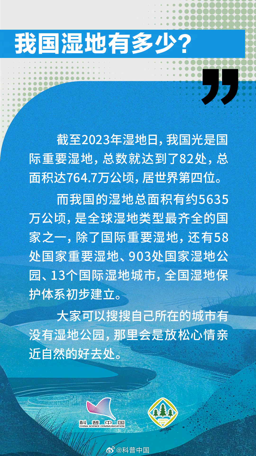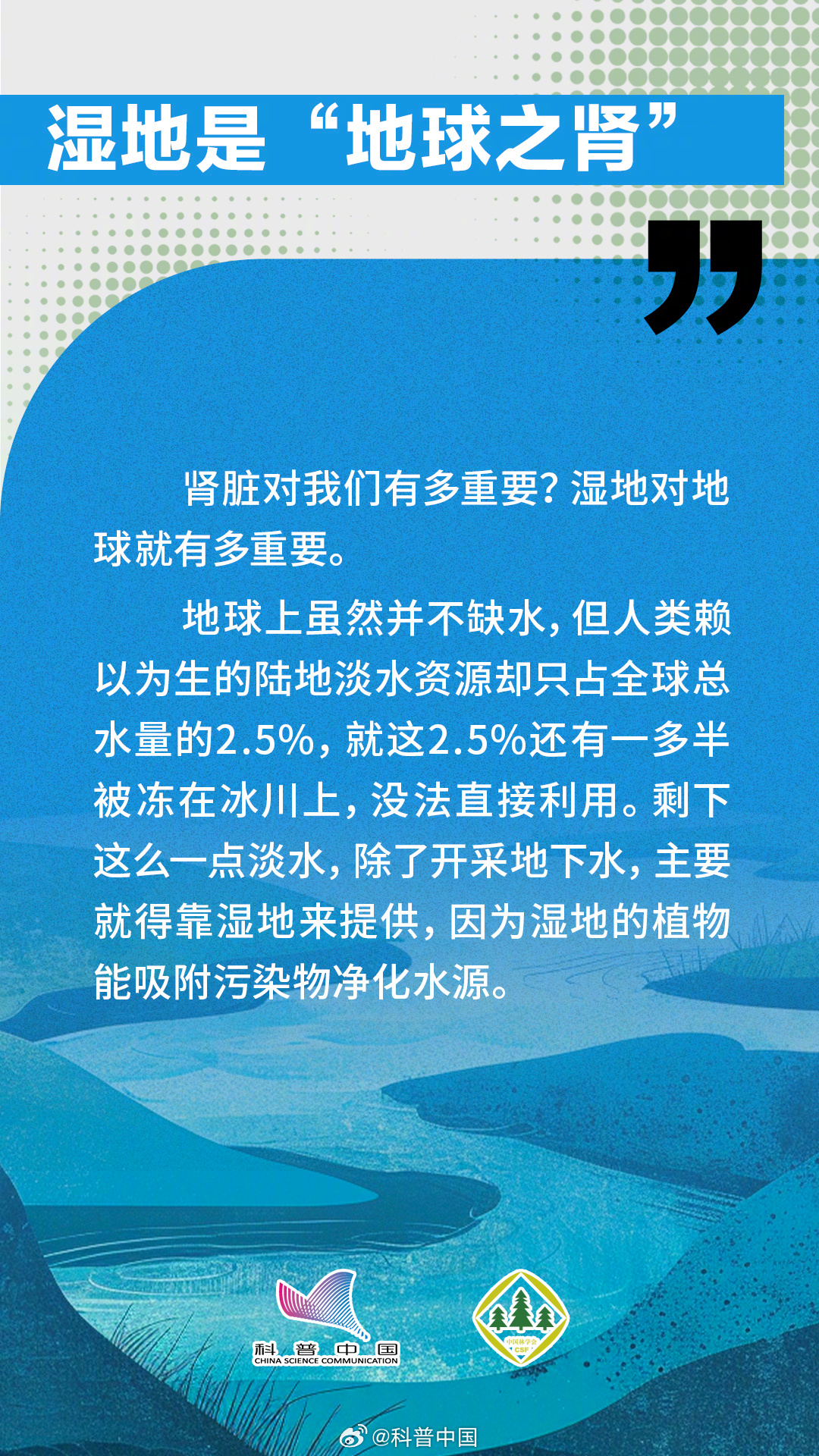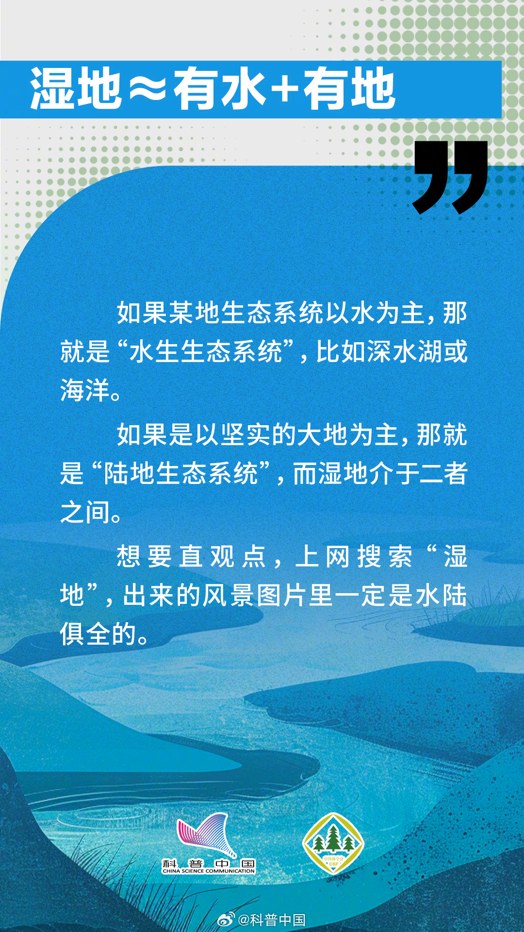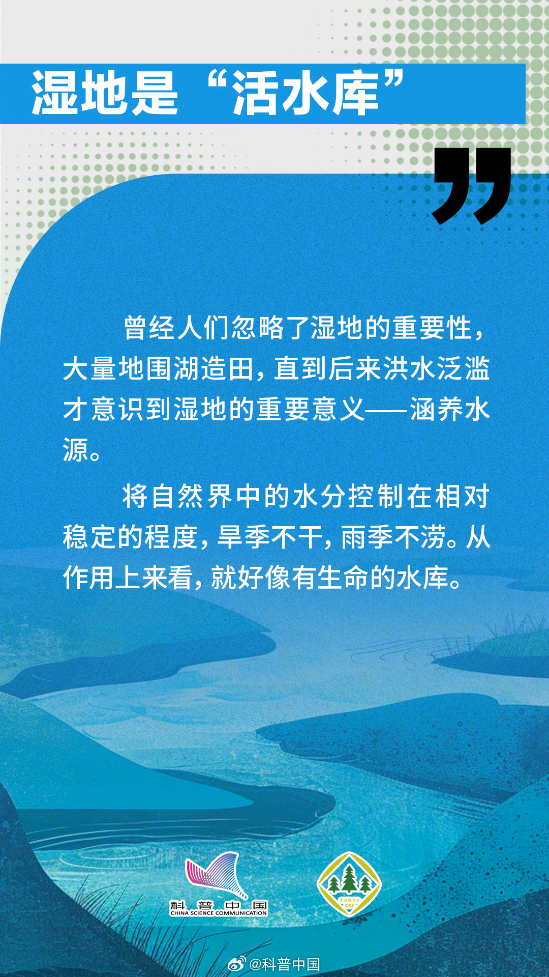 今天是2024年2月2日,第28个世界湿地日,主题是“湿地与人类福祉”。湿地介于水生生态系统和陆地生态系统之间,像海岸的浅滩、泥质的滩涂地和红树林都是非常重要的湿地类型。而且湿地还能起到涵养水源、防灾减灾、保护生态多样性的作用。究竟哪些做法会破坏湿地?湿地与人类之间又有什么关系呢?中国林学会与科普中国联合出品科普组图,让您了解“地球之肾”——湿地。