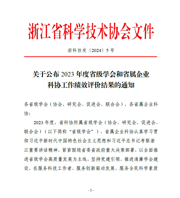 2024年2月18日,浙江省科协发布《关于公布 2023 年度省级学会和省属企业科协工作绩效评价结果的通知》(浙科协发〔2024〕5号)文件,浙江省林学会获2023年度工作绩效评价优秀单位。同时,在今年的科普评价工作中,浙江省林学会协同其他35家单位被浙江省科协科普部评为“2023 年度科普工作优秀组织单位”。