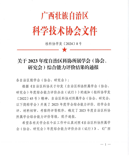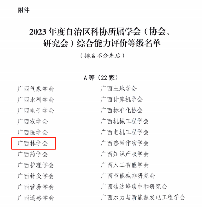 日前,从广西科协传来喜讯,广西林学会在自治区科协所属学会(协会、研究会)综合能力评价中荣获“A”等级。这也是学会继2022度后再获此殊荣。